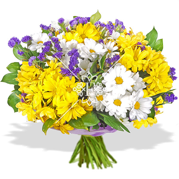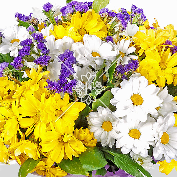 В букете использованы кустовые хризантемы белого и желтого цвета, а так же фиолетовые акценты статицы. Цветы считаются стойкими, и при правильном, незатейливом уходе будут радовать долгое время. Букет будет достаточно пышным даже в минимальной комплектации, а яркость оттенков разбавит красками любой, даже дождливый день.