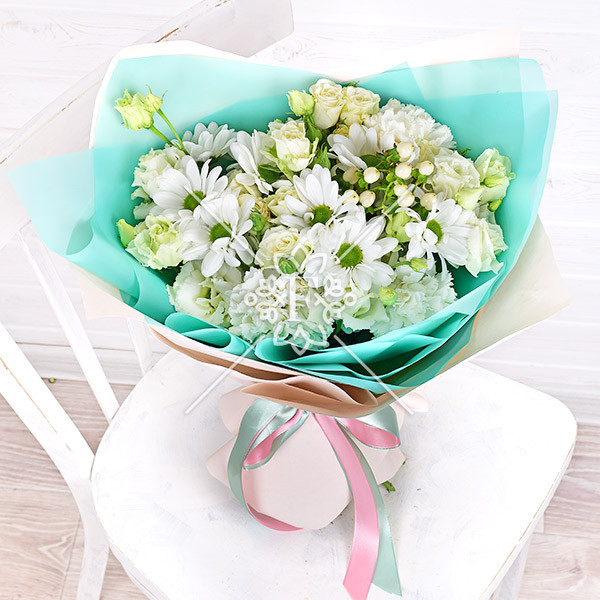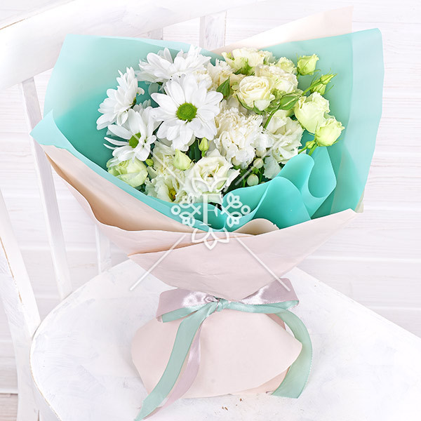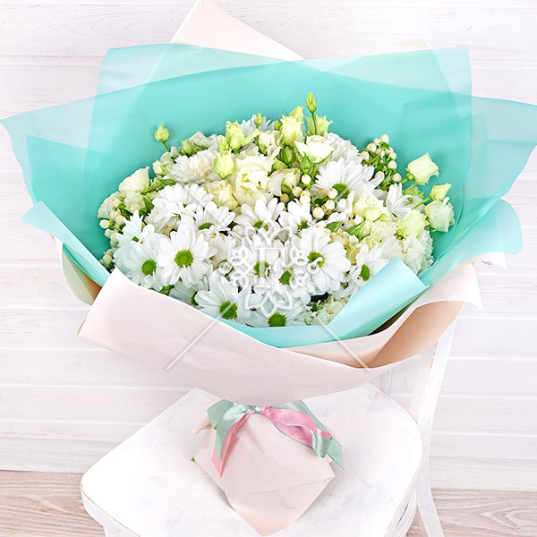Воздушный поцелуй – букет из кустовых хризантем, эустом и гвоздик
